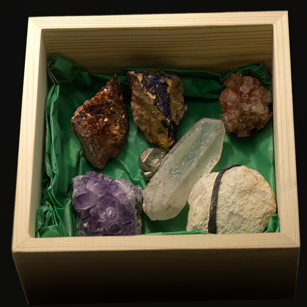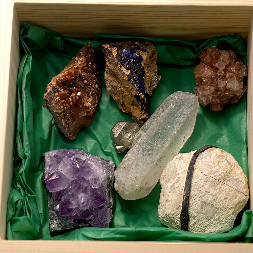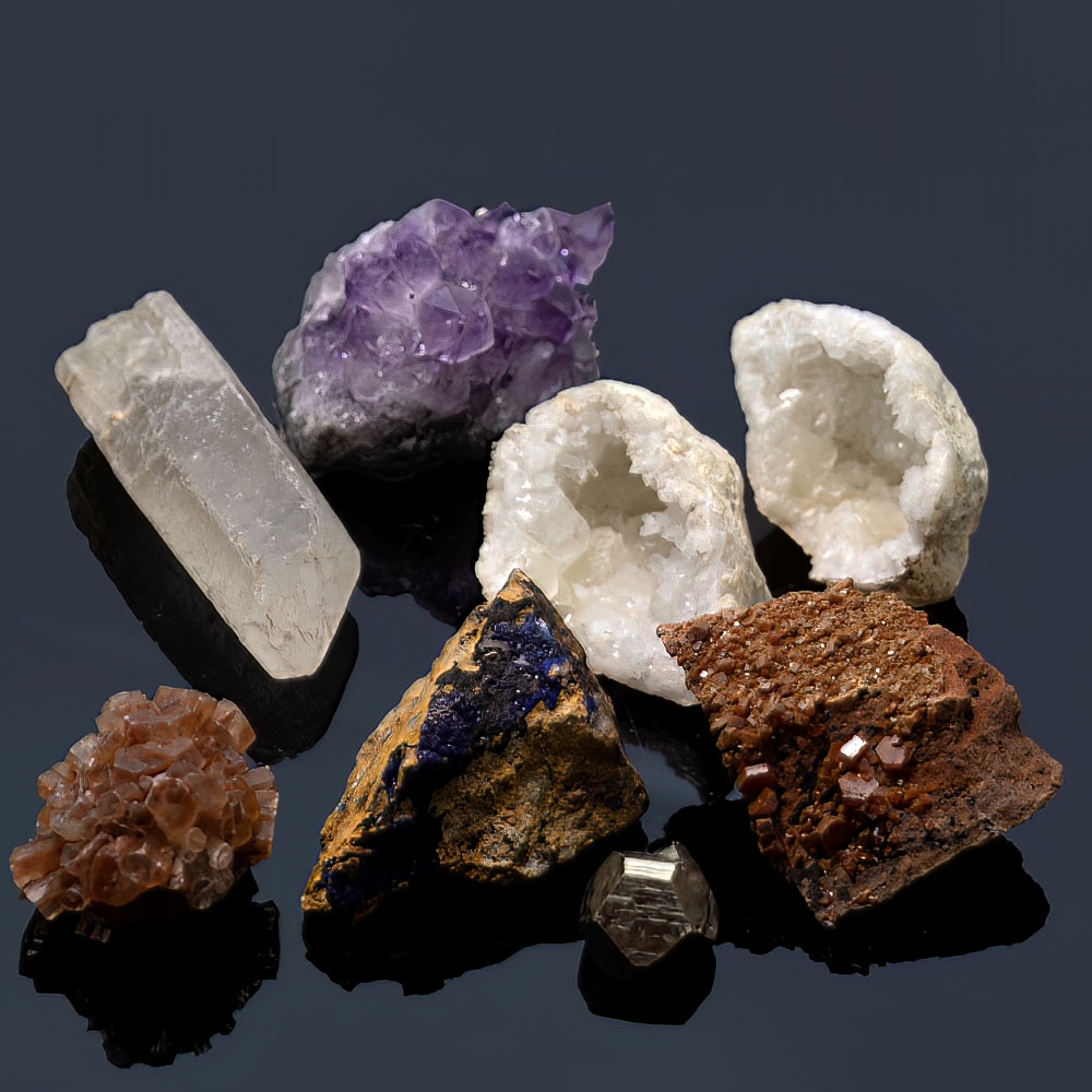 Vanadinit, Ametist, Kvartskristall, Pyritkristall, Kvartsgeod, Aragonit, Azurit