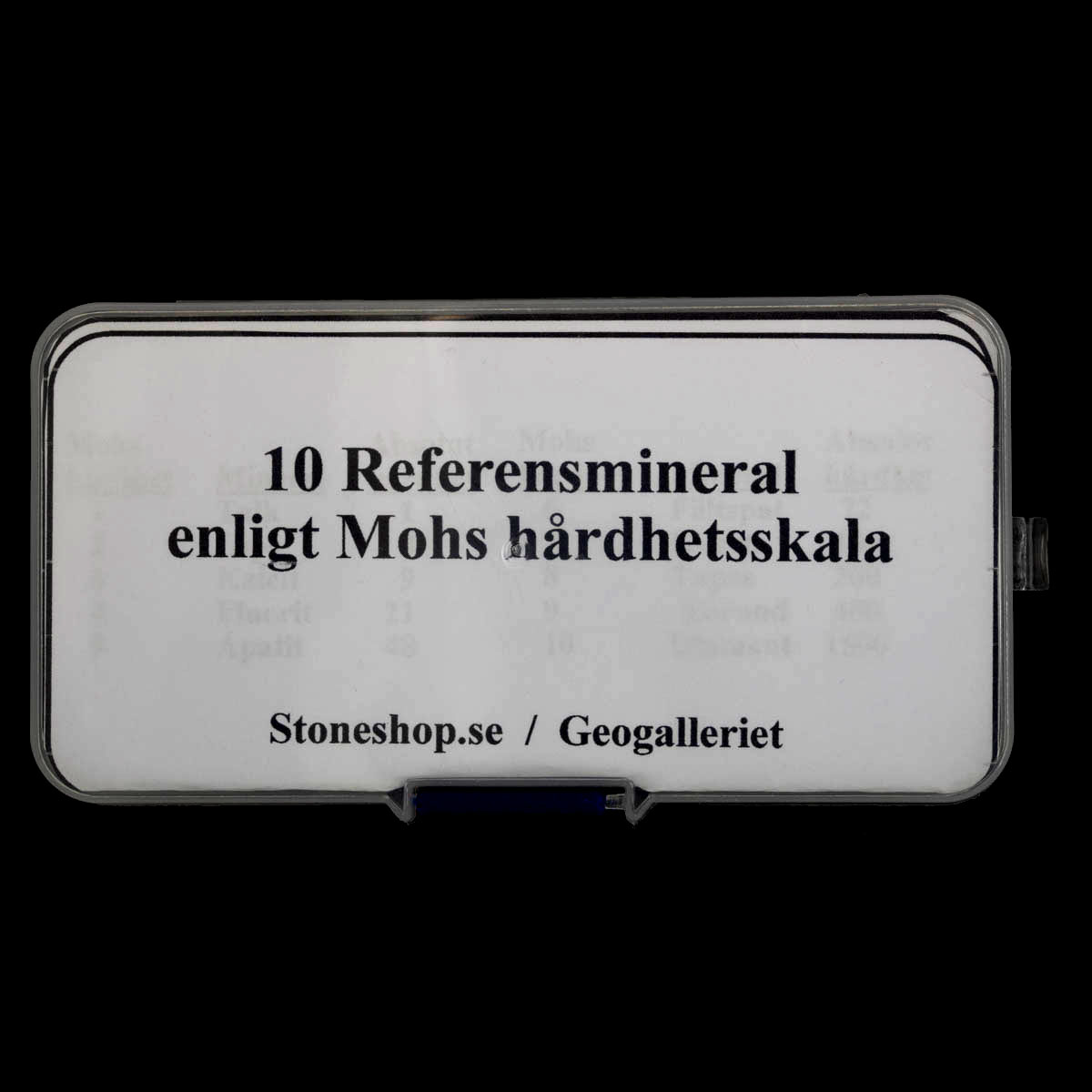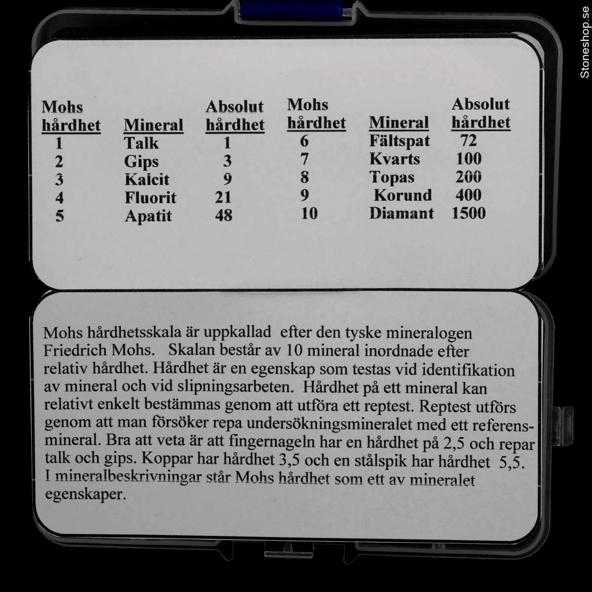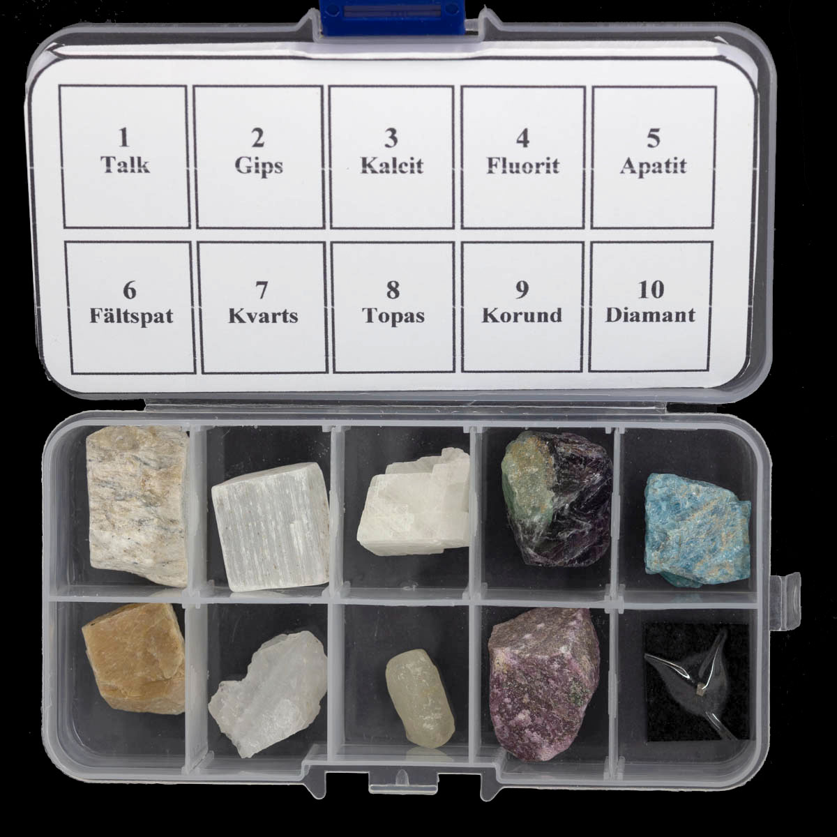10 mineral enligt Mohs hårdhetsskala. Med dessa kända referensmineral kan man undersöka rephårdheten på mineral.
