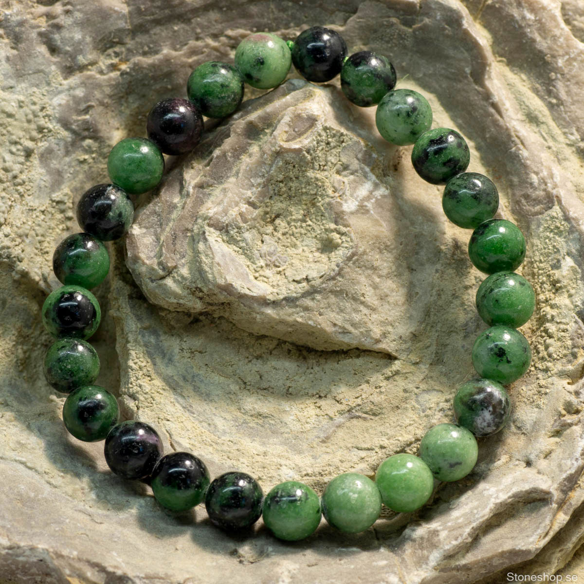 Zoisit med röd korund- armband. 8 mm runda stenar